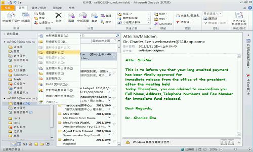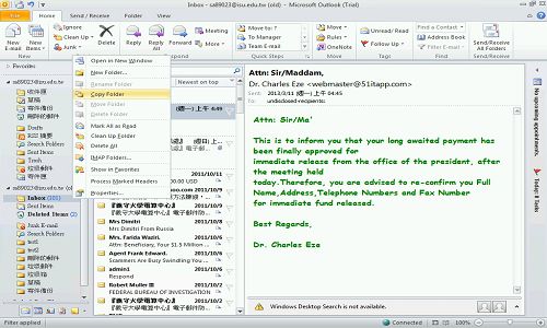 | 在[收件夾]點右鍵,選擇[複製資料夾]。 | Right click in "Inbox" and select "Copy folder". | ||