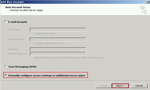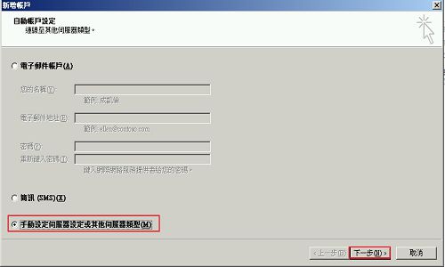 | 選擇[手動設定伺服器設定或其他伺服器類],並點[下一步]。 | Check "Manually configure server setting or additional server types" and click "Next". | ||
