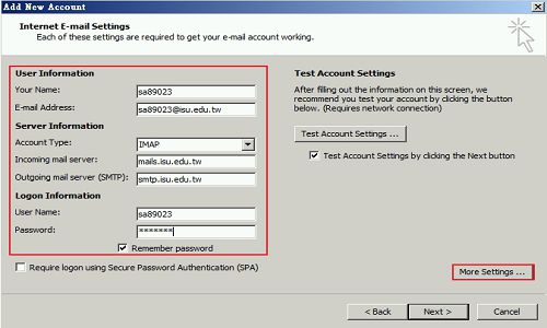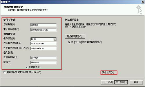 點[其他設定]。 | Select "IMAP", Set "Incoming mail server" and "Outgoing mail server". Click "More Settings...". | ||