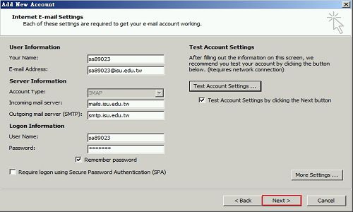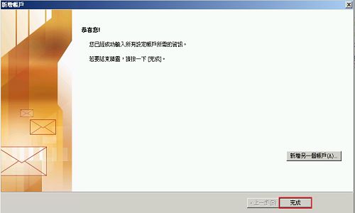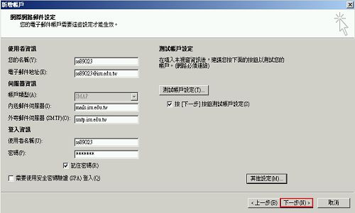 | 點[下一步],測試帳戶設定。 | Click "Next" to test account settings. | ||